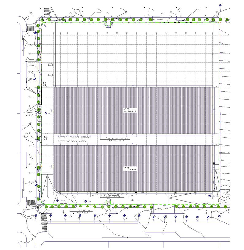 Toda la fachada se ejecuta con panel sándwich de acabado hormigón con árido gris. En la fachada principal y en unos 20 metros laterales, se dispone panel sandwinch horizontal, mientras que en el resto del perímetro, el panel es vertical de 2,40 metros de anchura, disponiendo cada pieza un hueco superior de iluminación o ventilación mediante rejilla. En las zonas de oficinas de planta baja y entreplanta, los huecos horizontales corridos a modo de muro cortina, iluminan y ventilan los espacios de trabajo.